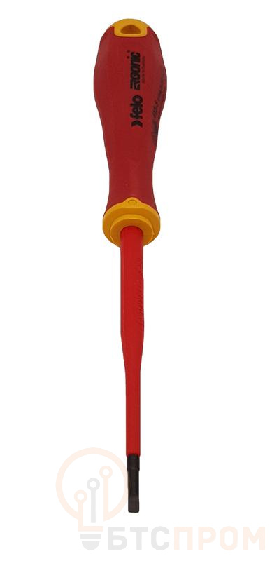 Отвертка диэлектрическая Felo серии E-Slim предназначена для проведения электромонтажных работ с крепежом сечения SL 3,0 в установках и электрощитах под напряжением до 1000 Вольт. Серия E-Slim отличается от обычных отверток более тонкой и удлиненной рукояткой (на 30% тоньше и на 20% длиннее) и утонченной изоляцией стержня (на 50% тоньше), что обеспечивает безопасное рабочее расстояние и лучший обзор. Гладкая бесшовная ручка с мягким внешним покрытием имеет улучшенную эргономику, так как выполнена по запатентованной технологии Felo ERGONIC - единственная в мире ручка, которая адаптируется к руке пользователя, обеспечивает превосходную эргономику, передачу крутящего момента и комфорт при работе. Стержень изготовлен из высококачественной инструментальной стали (CrMoV) дополнительно закаленной в масле и проходит по всей длине рукоятки. Все отвертки сертифицированы в соответствии с DIN EN 60900, который требует, чтобы каждый отдельный инструмент был протестирован под напряжением 10.000 Вольт.