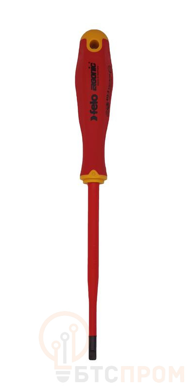 Отвертка диэлектрическая Felo серии E-Slim предназначена для проведения электромонтажных работ с крепежом сечения SL 5,5 в установках и электрощитах под напряжением до 1000 Вольт. Серия E-Slim отличается от обычных отверток более тонкой и удлиненной рукояткой (на 30% тоньше и на 20% длиннее) и утонченной изоляцией стержня (на 50% тоньше), что обеспечивает безопасное рабочее расстояние и лучший обзор. Гладкая бесшовная ручка с мягким внешним покрытием имеет улучшенную эргономику, так как выполнена по запатентованной технологии Felo ERGONIC - единственная в мире ручка, которая адаптируется к руке пользователя, обеспечивает превосходную эргономику, передачу крутящего момента и комфорт при работе. Стержень изготовлен из высококачественной инструментальной стали (CrMoV) дополнительно закаленной в масле и проходит по всей длине рукоятки. Все отвертки сертифицированы в соответствии с DIN EN 60900, который требует, чтобы каждый отдельный инструмент был протестирован под напряжением 10.000 Вольт.