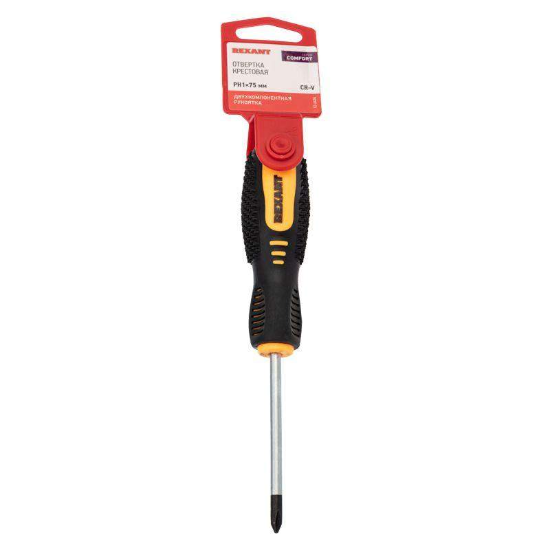 Отвертка крестовая REXANT предназначена для проведения монтажа и демонтажа резьбовых соединений: шурупов, саморезов и т. д. шурупов, саморезов и т. д. Стержень инструмента, устойчивый к коррозии, выполнен из качественной хромованадиевой стали и оснащен оксидированным намагниченным наконечником. Отвертка обладает эргономичной двухкомпонентной рукояткой, которая предотвращает скольжение в ладони и обеспечивает более комфортную работу. В основании изделия предусмотрено отверстие для его подвеса.