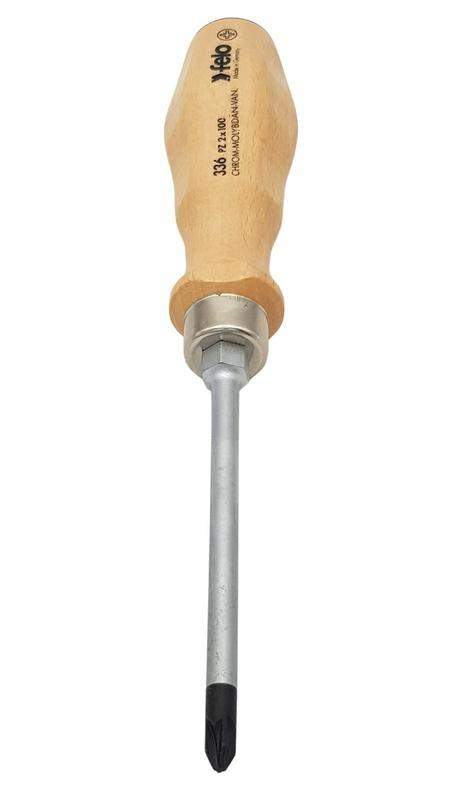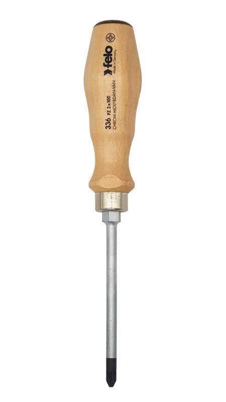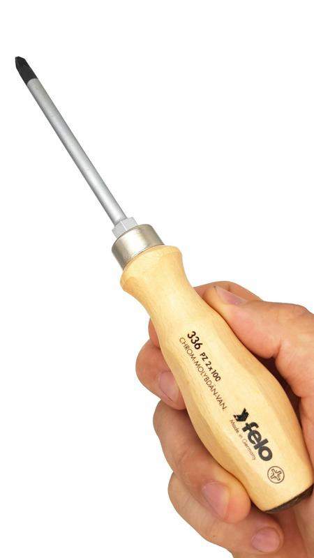 Отвертка ударная Felo серии 330 с деревянной рукояткой из твердого бука. Рукоятка имеет улучшенную эргономику для удобного хвата, максимальную передачу крутящего момента на крепеж и достижения наилучшего результата в работе! Продуманный дизайн рукоятки не позволяет инструменту скатываться с поверхности. Кожаный колпачок на рукоятке защитит ее от повреждений, сколов и растрескивания. Стержень изготовлен из высококачественной инструментальной стали (CrMoV), закалённой дополнительно в масле. На стержне имеется приваренная шестигранная гайка под ключ для придания дополнительного усилия на крепеж. Длина стержня - 100 мм. Общая длина - 210 мм.