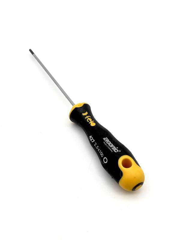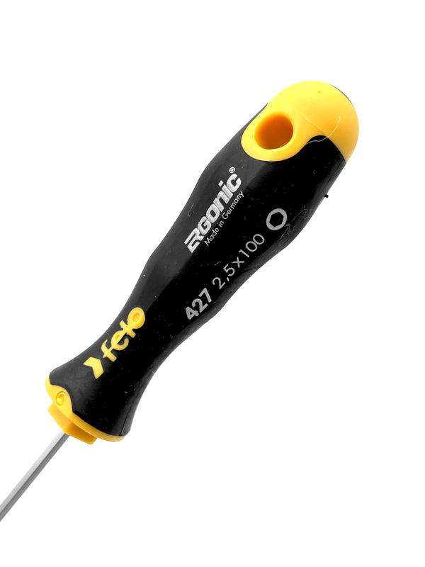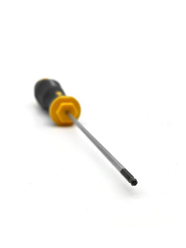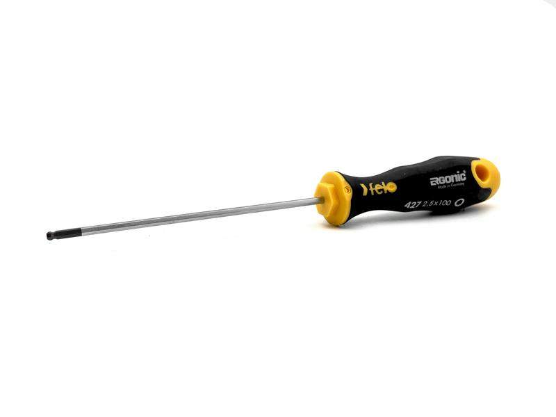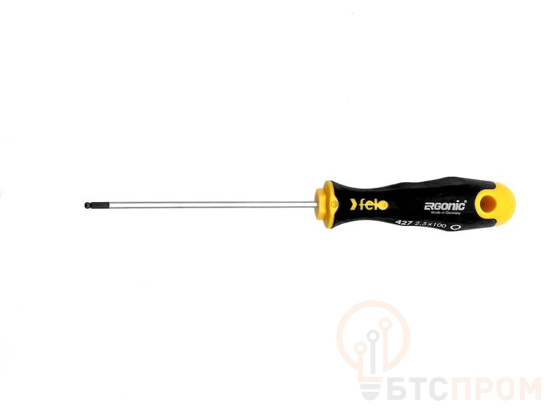 Отвертка Felo шестигранная HEX 2,5х100 с шаровым окончанием предназначена для монтажно-демонтажных работ с крепежом сечения HEX 2,5 в труднодоступных местах под углом 25°. На стержне имеется шестигранная гайка для придания дополнительного усилия ключом. Рукоятка ERGONIC - первая в мире бесшовная рукоятка, которая адаптируется под руку любого пользователя, снижает нагрузку и утомляемость, а также увеличивает комфорт и максимальный крутящий момент. Продуманный дизайн рукоятки не позволяет инструменту скатываться с поверхности. Внешнее покрытие рукоятки имеет высокую устойчивость к царапинам и ГСМ. На верхней части рукоятки указан тип шлица. Стержень изготовлен из высококачественной инструментальной стали, износостойкость и прочность которой превышает технические требования европейских стандартов DIN и ISO.