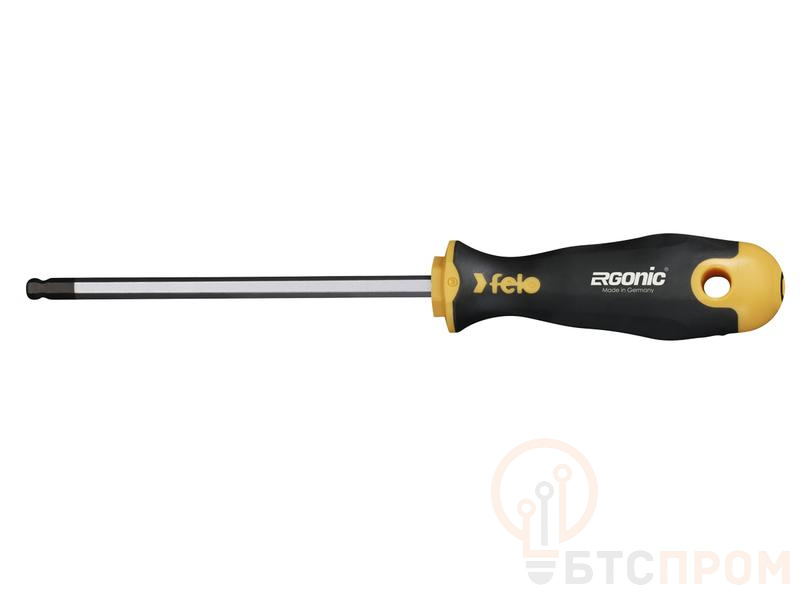 Отвертка Felo шестигранная HEX 4х100 с шаровым окончанием предназначена для монтажно-демонтажных работ с крепежом сечения HEX 4 в труднодоступных местах под углом 25°. На стержне имеется шестигранная гайка для придания дополнительного усилия ключом. Рукоятка ERGONIC - первая в мире бесшовная рукоятка, которая адаптируется под руку любого пользователя, снижает нагрузку и утомляемость, а также увеличивает комфорт и максимальный крутящий момент. Продуманный дизайн рукоятки не позволяет инструменту скатываться с поверхности. Внешнее покрытие рукоятки имеет высокую устойчивость к царапинам и ГСМ. На верхней части рукоятки указан тип шлица. Стержень изготовлен из высококачественной инструментальной стали, износостойкость и прочность которой превышает технические требования европейских стандартов DIN и ISO.