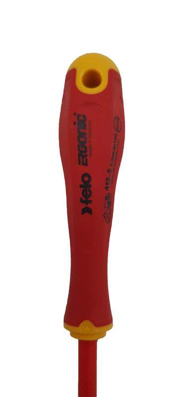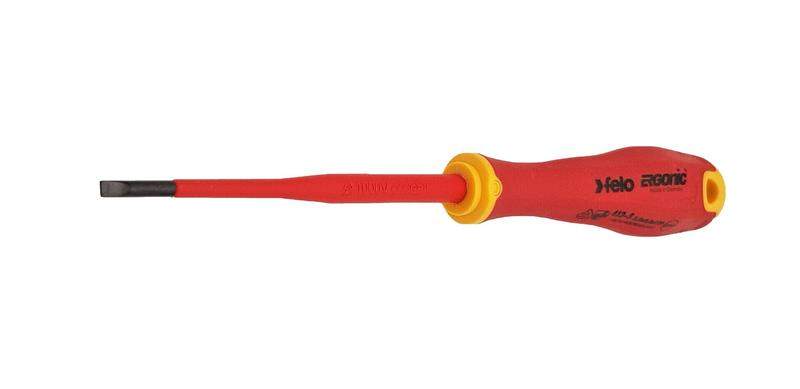 Отвертка диэлектрическая Felo серии E-Slim предназначена для проведения электромонтажных работ с крепежом сечения SL 3,5 в установках и электрощитах под напряжением до 1000 Вольт. Серия E-Slim отличается от обычных отверток более тонкой и удлиненной рукояткой (на 30% тоньше и на 20% длиннее) и утонченной изоляцией стержня (на 50% тоньше), что обеспечивает безопасное рабочее расстояние и лучший обзор. Гладкая бесшовная ручка с мягким внешним покрытием имеет улучшенную эргономику, так как выполнена по запатентованной технологии Felo ERGONIC - единственная в мире ручка, которая адаптируется к руке пользователя, обеспечивает превосходную эргономику, передачу крутящего момента и комфорт при работе. Стержень изготовлен из высококачественной инструментальной стали (CrMoV) дополнительно закаленной в масле и проходит по всей длине рукоятки. Все отвертки сертифицированы в соответствии с DIN EN 60900, который требует, чтобы каждый отдельный инструмент был протестирован под напряжением 10.000 Вольт.