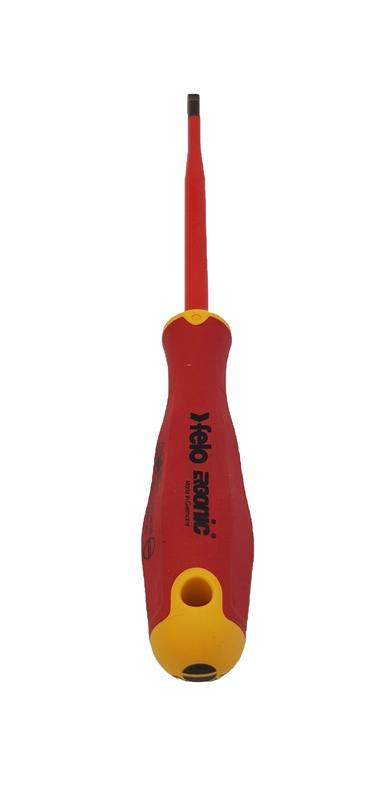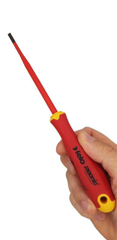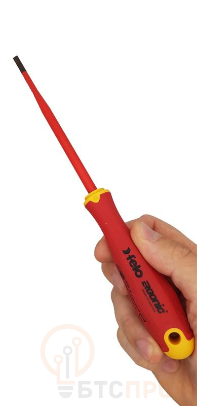Отвертка диэлектрическая Felo серии E-Slim предназначена для проведения электромонтажных работ с крепежом сечения SL 4,5 в установках и электрощитах под напряжением до 1000 Вольт. Серия E-Slim отличается от обычных отверток более тонкой и удлиненной рукояткой (на 30% тоньше и на 20% длиннее) и утонченной изоляцией стержня (на 50% тоньше), что обеспечивает безопасное рабочее расстояние и лучший обзор. Гладкая бесшовная ручка с мягким внешним покрытием имеет улучшенную эргономику, так как выполнена по запатентованной технологии Felo ERGONIC - единственная в мире ручка, которая адаптируется к руке пользователя, обеспечивает превосходную эргономику, передачу крутящего момента и комфорт при работе. Стержень изготовлен из высококачественной инструментальной стали (CrMoV) дополнительно закаленной в масле и проходит по всей длине рукоятки. Все отвертки сертифицированы в соответствии с DIN EN 60900, который требует, чтобы каждый отдельный инструмент был протестирован под напряжением 10.000 Вольт.