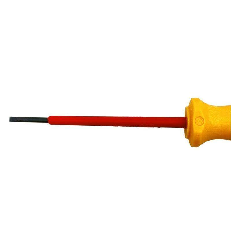 Отвертка диэлектрическая шлицевая серии 900 предназначена для работ с крепежом SL 2,5х0,4 под напряжением до 1000 В. Эргономичный дизайн рукоятки и противоскользящий материал (Soft Grip) помогает обеспечить наибольшую передачу усилия. Специальный дизайн двухкопонентной рукоятки не позволяет инструменту скатываться с поверхности. Лезвия изготовлены из специальной хромомолибден-ванадиевой стали для достижения наилучшего результата при работе! Точная посадка в крепеж обеспечивается за счет черного наконечника (Black-Tip).