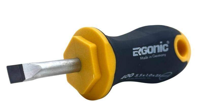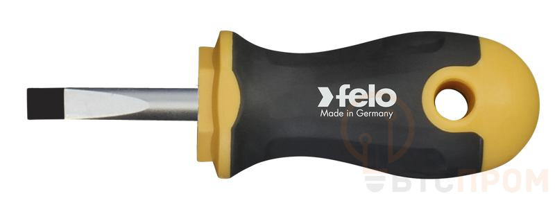 "Укороченная шлицевая отвертка Felo Stubby длиной 85 мм предназначена для монтажно-демонтажных работ с крепежом типа SL 5.5 в местах, где пространство ограничено. Рукоятка ERGONIC - первая в мире бесшовная рукоятка, которая адаптируется под руку любого пользователя, снижает нагрузку и утомляемость, а также увеличивает комфорт и максимальный крутящий момент. Продуманный дизайн рукоятки не позволяет инструменту скатываться с поверхности. Внешнее покрытие рукоятки имеет высокую устойчивость к царапинам и ГСМ. На верхней части рукоятки указан тип шлица. Стержень изготовлен из высококачественной инструментальной стали, износостойкость и прочность которой превышает технические требования европейских стандартов DIN и ISO."