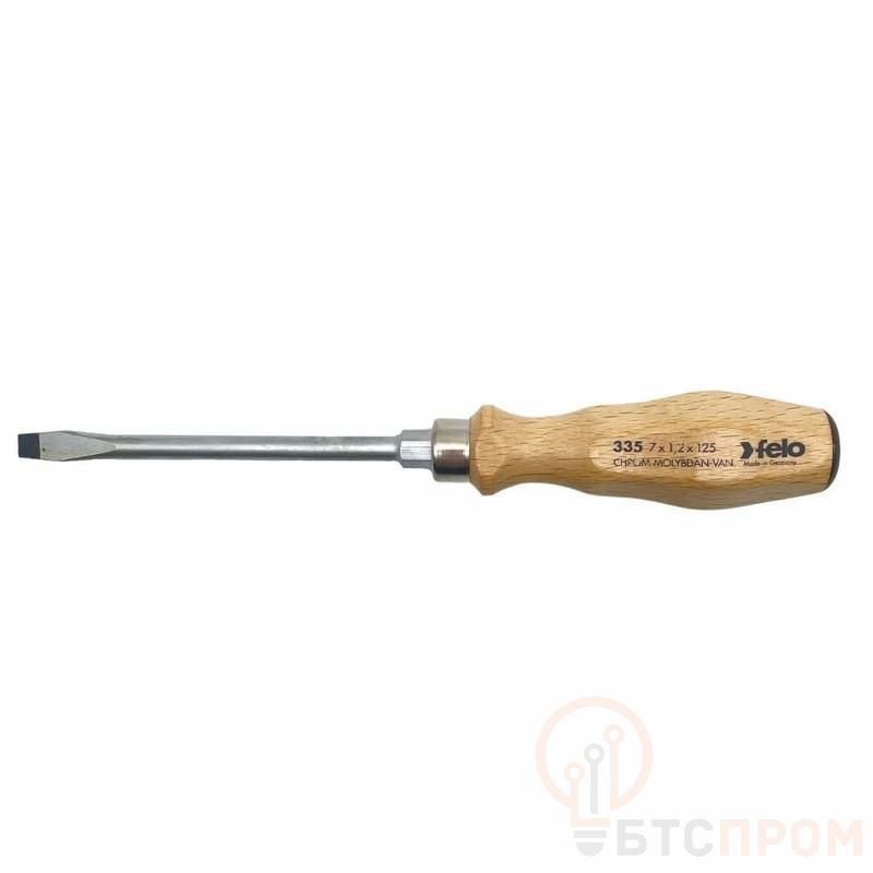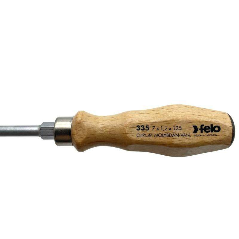 Отвертка ударная Felo серии 330 с деревянной рукояткой из твердого бука. Рукоятка имеет улучшенную эргономику для удобного хвата, максимальную передачу крутящего момента на крепеж и достижения наилучшего результата в работе! Продуманный дизайн рукоятки не позволяет инструменту скатываться с поверхности. Кожаный колпачок на рукоятке защитит ее от повреждений, сколов и растрескивания. Стержень изготовлен из высококачественной инструментальной стали (CrMoV), закалённой дополнительно в масле. На стержне имеется приваренная шестигранная гайка под ключ для придания дополнительного усилия на крепеж. Длина стержня - 125 мм. Общая длина - 235 мм.