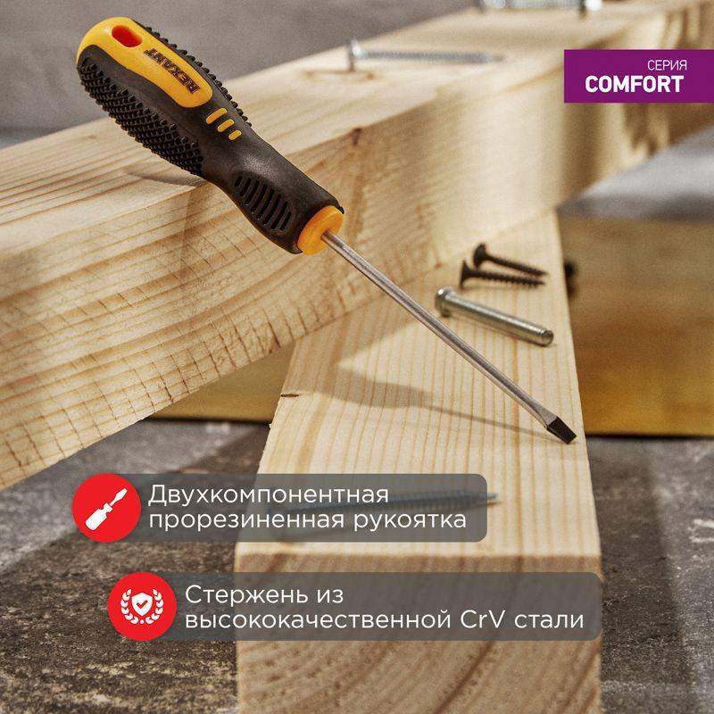 Отвертка SL3х75 мм REXANT используется для монтажа и демонтажа резьбовых соединений (шурупов, саморезов), имеющих на головке прямой паз. Оснащена эргономичной двухкомпонентной рукояткой, которая предотвращает скольжение в ладони и обеспечивает более комфортную работу. Инструмент обладает стержнем, который изготовлен из высококачественной хромованадиевой стали, характеризующейся высокой стойкостью к коррозии. Благодаря намагниченному наконечнику крепежная деталь не упадет при извлечении или установке. В основании инструмента предусмотрено отверстие для его подвеса.