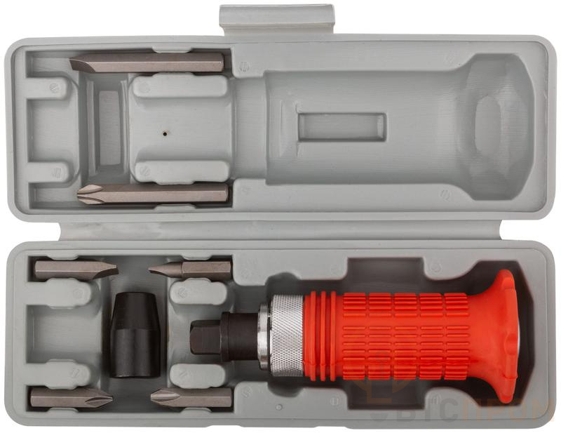 Отвертка ударная FIT – это профессиональный инструмент, предназначенный для завинчивания и отвинчивания шурупов и болтов с применением ударной силы. Отвертка оснащена специальным механизмом, который преобразует удар молотка во вращательное движение, что позволяет отвинчивать прикипевшие и заржавевшие крепежные элементы. Набор включает шесть специальных бит из хромованадиевой стали CrV с разными типами шлицев и размерами, что позволяет работать с различными типами крепежа. Резиновая ручка обеспечивает комфортный хват и поглощает вибрацию при ударе. Пластиковый кейс обеспечивает удобное хранение и транспортировку набора.