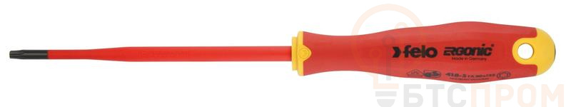 Отвертка диэлектрическая Felo серии E-Slim предназначена для проведения электромонтажных работ с крепежом сечения типа Tprx 10 в установках и электрощитах под напряжением до 1000 Вольт. Серия E-Slim отличается от обычных отверток более тонкой и удлиненной рукояткой (на 30% тоньше и на 20% длиннее) и утонченной изоляцией стержня (на 50% тоньше), что обеспечивает безопасное рабочее расстояние и лучший обзор. Гладкая бесшовная ручка с мягким внешним покрытием имеет улучшенную эргономику, так как выполнена по запатентованной технологии Felo ERGONIC - единственная в мире ручка, которая адаптируется к руке пользователя, обеспечивает превосходную эргономику, передачу крутящего момента и комфорт при работе. Стержень изготовлен из высококачественной инструментальной стали (CrMoV) дополнительно закаленной в масле и проходит по всей длине рукоятки. Все отвертки сертифицированы в соответствии с DIN EN 60900, который требует, чтобы каждый отдельный инструмент был протестирован под напряжением 10.000 Вольт.