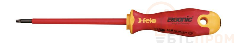 Диэлектрическая отвертка Felo Torx предназначена для электромонтажных работ с крепежом типа Тх 20 в электроустановках под напряжением до 1000 Вольт. Рукоятка ERGONIC - первая в мире бесшовная рукоятка, которая адаптируется под руку любого пользователя, снижает нагрузку и утомляемость, а также увеличивает комфорт и максимальный крутящий момент. Продуманный дизайн рукоятки не позволяет инструменту скатываться с поверхности. Внешнее покрытие рукоятки имеет высокую устойчивость к царапинам и ГСМ. Отверстие в рукоятке позволяет для удобного хранения на стене, а также применять инструмент в качестве дополнительного рычага. На верхней части рукоятки указан тип шлица. Стержень изготовлен из высококачественной инструментальной стали, износостойкость и прочность которой превышает технические требования европейских стандартов DIN и ISO. Все VDE отвертки сертифицированы в соответствии с DIN EN 60900, который требует, чтобы каждый отдельный инструмент был протестирован под напряжением 10.000 Вольт.