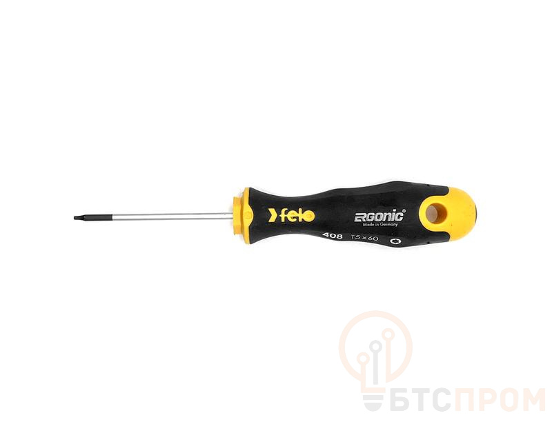 Отвертка Felo звездочка Torx 5х60 предназначена для монтажно-демонтажных работ с крепежом сечения Torx 5. Рукоятка ERGONIC - первая в мире бесшовная рукоятка, которая адаптируется под руку любого пользователя, снижает нагрузку и утомляемость, а также увеличивает комфорт и максимальный крутящий момент. Продуманный дизайн рукоятки не позволяет инструменту скатываться с поверхности. Внешнее покрытие рукоятки имеет высокую устойчивость к царапинам и ГСМ. На верхней части рукоятки указан тип шлица. Стержень изготовлен из высококачественной инструментальной стали, износостойкость и прочность которой превышает технические требования европейских стандартов DIN и ISO.