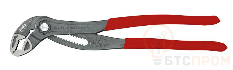 Клещи переставные Felo подходят для работы с разными деталями при проведении слесарных, монтажных, сантехнических работ, а также в строительстве для зажатия, зажима и обжатия заготовок. Зев раскрывается на максимальное расстояние в 65 мм. Фиксация размера происходит нажатием на кнопку, которая полностью исключает нечаянную перестановку размера ключа. Зубчатая форма губок внутри предотвращает соскальзывание инструмента. При изготовлении деталей используется хромованадиевая сталь, прошедшая закаливание в масле. Ручки выполнены из пластика.