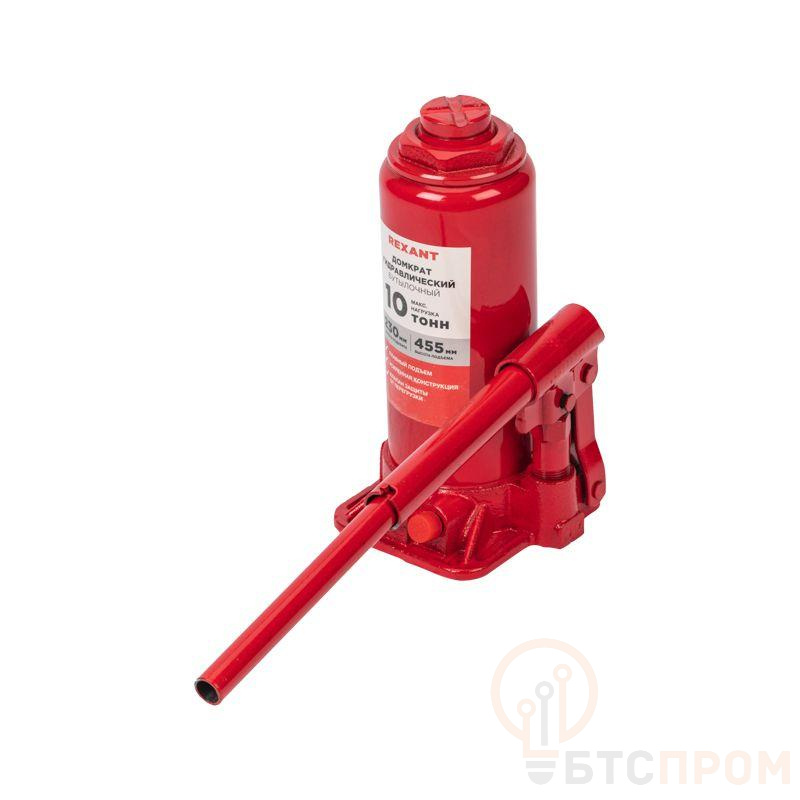 Гидравлический бутылочный домкрат REXANT предназначен для поднятия грузов массой до 10 тонн на высоту до 455 мм. Оптимален для автомобилей с большим клиренсом. Оснащен гидравлической системой, обеспечивающей высокую мощность и надежность. Домкрат станет незаменимым помощником как для автолюбителей, так и для профессионалов на СТО. Отличается плавностью хода, надежностью и жесткостью конструкции. Клапан безопасности предотвращает подъем груза тяжелее 10 т, предохраняя домкрат от поломки. Максимальная нагрузка – 10 т. Высота подхвата – 230 мм. Высота подъема – 455 мм. Материал корпуса – сталь, чугун.