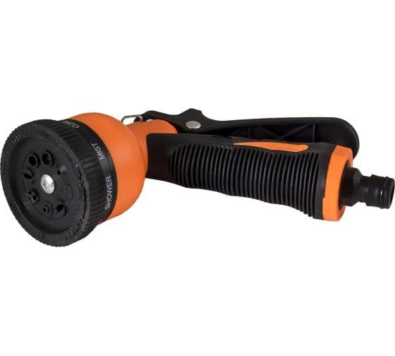 Пистолет-распылитель, 8 режимов полива эргономичная прорезиненная рукоятка, регулировка напора воды металлическая.