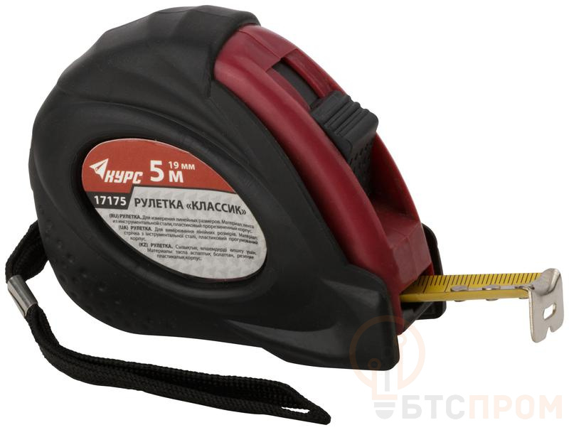 Рулетка с двойным стопором, предназначена для измерений линейных размеров. Корпус рулетки изготовлен из ударопрочного ABS-пластика, устойчивого к механическим воздействиям. Резиновые накладки на корпусе предотвращают повреждения инструмента при падении или ударе. Полимерное покрытие измерительной ленты защищает шкалу от истирания. Рулетку можно крепить на ремне с помощью металлической клипсы. Тканевый ремешок позволяет носить рулетку на руке или хранить в подвешенном положении.