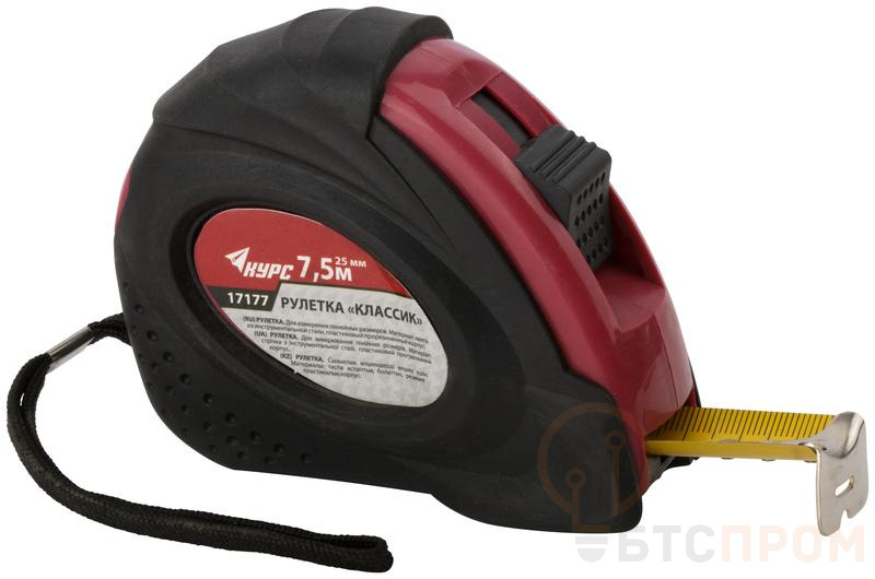 Рулетка с двойным стопором, предназначена для измерений линейных размеров. Корпус рулетки изготовлен из ударопрочного ABS-пластика, устойчивого к механическим воздействиям. Резиновые накладки на корпусе предотвращают повреждения инструмента при падении или ударе. Полимерное покрытие измерительной ленты защищает шкалу от истирания. Рулетку можно крепить на ремне с помощью металлической клипсы. Тканевый ремешок позволяет носить рулетку на руке или хранить в подвешенном положении.