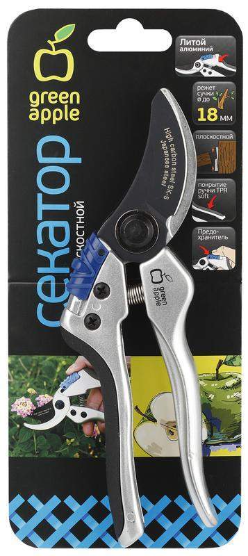 Плоскостной секатор GREEN APPLE предназначен для аккуратной обрезки молодых побегов, зеленых веток и цветов.Антикоррозийное, грязеотталкивающее покрытие верхнего лезвияПредохранитель под большой палец рукиЛитые ручки с вставками из термопластичной резины с противоскользящими свойствамиЛитой алюминий. Легкий, надежный для комфортной и удобной резки