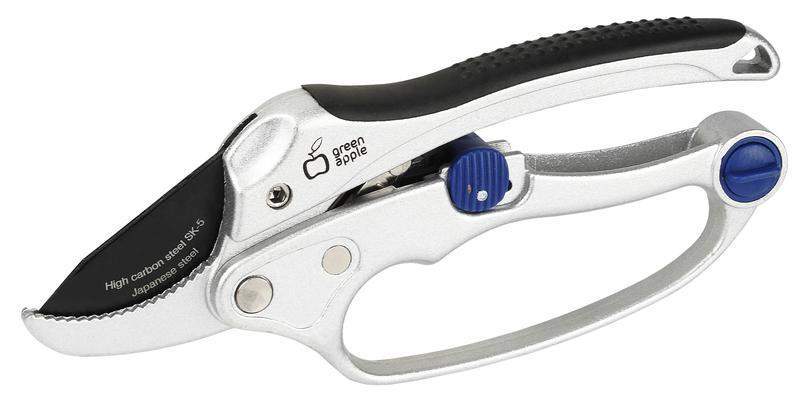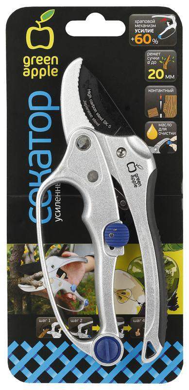 Усиленный секатор GREEN APPLE с храповым механизмом предназначен для обрезки без дополнительных усилий толстых веток и лозы. Храповой механизм позволяет за несколько приемов справиться даже с самыми толстыми ветками.