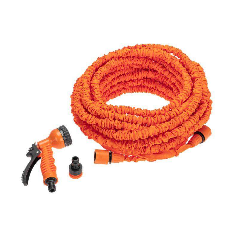 Поливочный набор применяется при организации систем полива и систем водоснабжения. Включает в себя растягивающийся шланг, пистолет-распылитель, а также 2 коннектора для соединения. Поливочный шланг устойчив к износу и воздействию внешних факторов, не образует перегибов. Размер шланга в сложенном виде 15 метров. При подаче воды он растягивается до 45 метров. При хранении не занимает много места. Пистолет-распылитель оснащен эргономичной ручкой, благодаря которой изделие удобно и комфортно держать в руке. Имеет 7 режимов подачи воды, регулируемых поворотной головкой. Также на пистолете предусмотрен фиксатор, позволяющий зафиксировать курок и не зажимать его пальцами в процессе полива. Набор комплектуется соединителем для быстрого и удобного подключения шланга к поливочной системе.