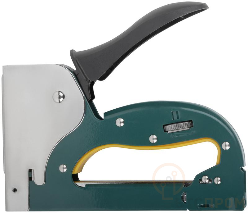 "Профи". Для скоб "Тип 53". Ударный механизм рессорного типа. Регулировка силы удара. Для закрепления обивки мебели, укрепления плакатов, закрепления проволочной сетки и строительства теплиц. Используется со скобами 31304-31314, 31404-31414, 31361-31365. Материал: инструментальная сталь, пластиковая прорезиненная ручка, ПВХ вставка. Упаковка: блистер.