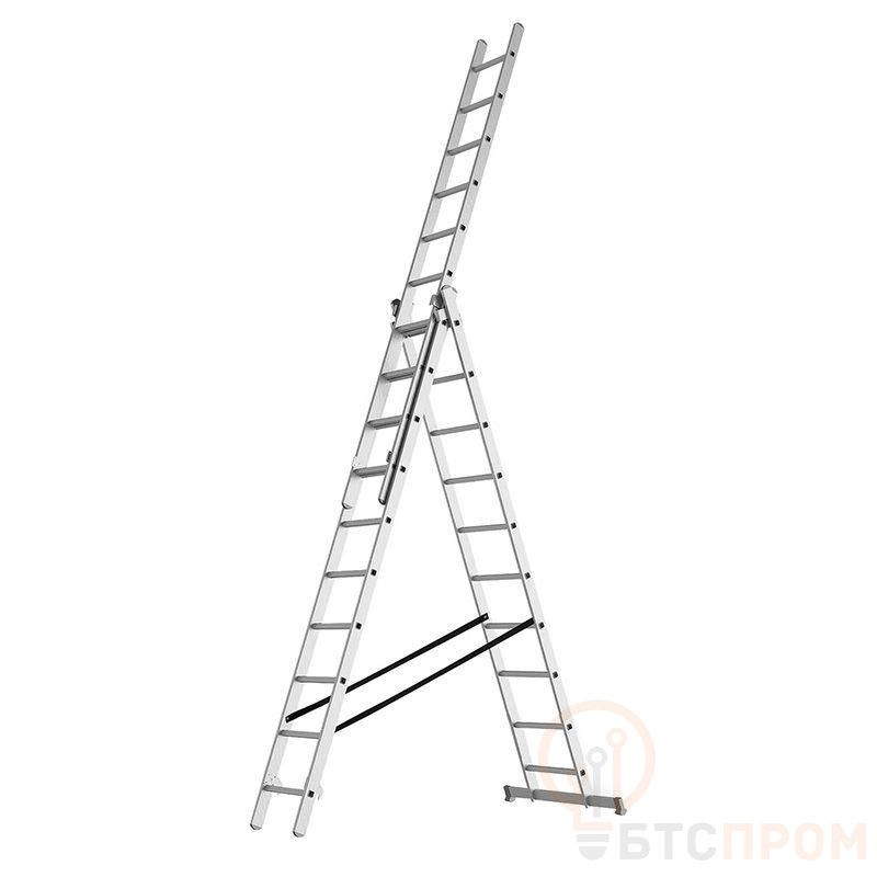 Трехсекционная алюминиевая лестница REXANT – универсальное мобильное приспособление, позволяющее быстро и безопасно произвести работы на высоте. Многофункциональные конструкции незаменимы для выполнения монтажных работ в производственных помещениях, при ремонте квартир и офисов, для работы на даче, при сборе урожая в саду и пр. Лестница произведена из специального прочного алюминиевого сплава, не подвергающимся коррозии. Она легко складывается и может использоваться как одинарная. Специально сконструированные ступени предотвращают скольжение. Технические характеристики: Высота лестницы: 574 см Ширина: 35,5 см/41 см/46,5 см Ширина тетивы: 70 см Количество: 9 ступеней Вес: 15 кг