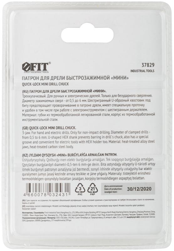 Патрон быстрозажимной трехкулачковый ''Мини'' FIT IT с шестигранным U-образным хвостовиком под биту используется с ручными и электрическими дрелями в режиме безударного сверления. Предназначен для зажима оснастки. Корпус патрона выполнен из инструментальной стали, губки - из легированной стали, что обеспечивают долговечность изделия.