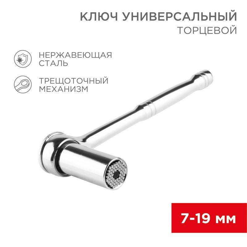 Универсальный торцевой ключ с трещоткой REXANT широко применяется в автомастерских и гаражах при проведении слесарных работ. Оснащен универсальным гнездом с 54 элементами внутри, которые принимают форму любых винтов, шурупов, гаек, крючков и головок болтов. Обладает широким диапазоном регулировки от 7 до 19 мм. Инструмент выполнен из прочного материала – нержавеющей стали, которая имеет высокую устойчивость к коррозии и обеспечивает долгий срок службы. Надежные механизмы позволяют снизить усилие при работе с ключом и обеспечивают дополнительный комфорт.