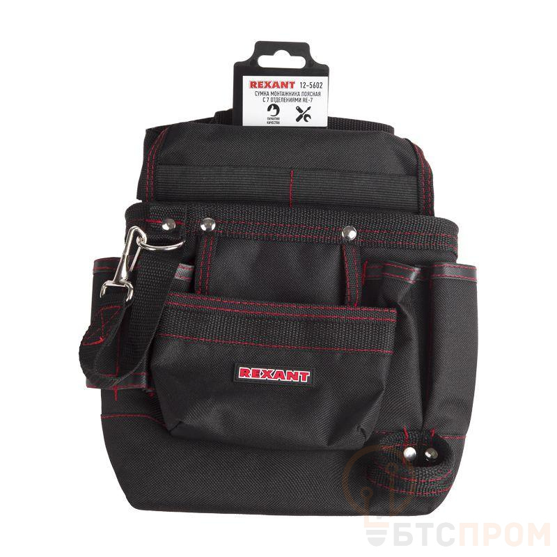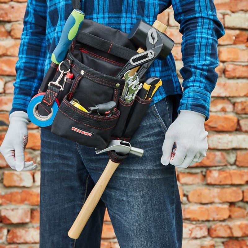 Поясная сумка монтажника REXANT RE-7 предназначена для удобного хранения инструментов. Оснащена 7 отделениями и тканевой петлей для подвешивания молотка. Предусмотрен карабин для фиксации мелких инструментов и деталей, например, изоленты, проволоки, кабеля. Сумка оптимально подходит для работ на высоте, позволяет оставлять руки свободными. Ремень регулируется по длине. Сумка выполнена из прочного влагонепроницаемого материала: содержимое надежно защищено от механических воздействий и загрязнений. Характеристики: Размеры: 26,5х3х26 см Длина пояса: 140 см Количество отделений: 7 шт. Материал: ткань «Оксфорд» 600D PVC PU, сталь Преимущества: Выполнена из прочных долговечных материалов Влагозащищенный материал Металлические части изготовлены из коррозиестойкого металла Металлические заклепки в местах наивысшей нагрузки обеспечивают долгий срок службы