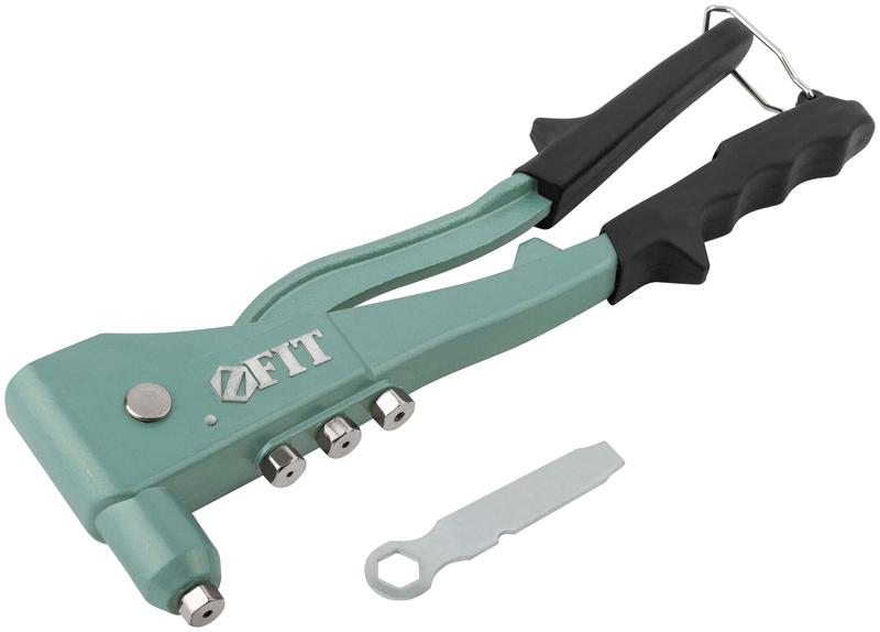 Заклепочник FIT IT Профи предназначен для создания соединений с помощью алюминиевых вытяжных заклепок. Заклёпочник имеет четыре быстросменные насадки и пружинный рычаг для выброса сердечника. Рукоятки из инструментальной стали с виниловым покрытием предотвращают проскальзывание инструмента во время работы. Литой корпус из алюминиевого сплава обладает высокой прочностью. Заклепочник предназначен для работы с заклепками 2,4; 3,2; 4,0; 4,8 мм.