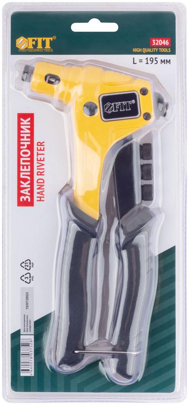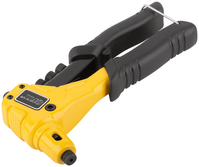 Профи. Для крепления вытяжных заклепок из алюминия, стали и нержавеющей стали. Усиленная конструкция. 4 быстросъемные насадки. Материал: литой корпус из алюминиевого сплава, трехкулачковый механизм захвата заклепок из хром-молибденовой стали, подвижная рукоятка и насадки из инструментальной стали, ПВХ накладки на рукоятках. Упаковка: блистер.