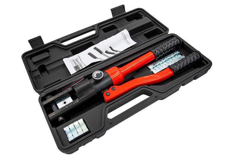 Гидравлические прессы марки НСТ используются для опрессовки неизолированных наконечников, соединительных гильз — медного и алюминиевого исполнения. Допускается применение пресса с гильзами/наконечниками, выполненных из сплавов цветных металлов. Пресс марки НСТ представляет собой устройство, состоящее из гидравлической камеры с рабочим штоком, заполненной гидравлическим маслом, плунжерным насосом соединенным с рукоятками изделия, клапаном/механизмом сброса давления, рабочей головкой закрепленной на рабочем штоке. Рабочая головка представляет собой ложемент для установки сменных гексагональных матриц. Для модели НСТ-70, фиксация матриц осуществляется в нижней и верхней части рабочей головки, исключая возможность свободного выпадения матриц в процессе эксплуатации. Модели НСТ-120 и НСТ-300 имеют ограничительный палец, устанавливаемый в паз рабочей головки после установки матриц. (ВНИМАНИЕ! Запрещается превышать номинальное усилие обжатия, во избежание повреждения сальников и прокладок) В наличии имеется комплект резиновых колец для обслуживания пресса — 2 малых и 1 большое — силиконовых кольца, фторопластовые прокладки — малая и большая Поставляются в кейсе с защелками . Кейс снабжен ручками для переноски. Руководство по эксплуатации поставляется в комплекте с изделием! Наличие маркировки на корпусе изделия и кейсе — ТМ, тип изделия, дата изготовления