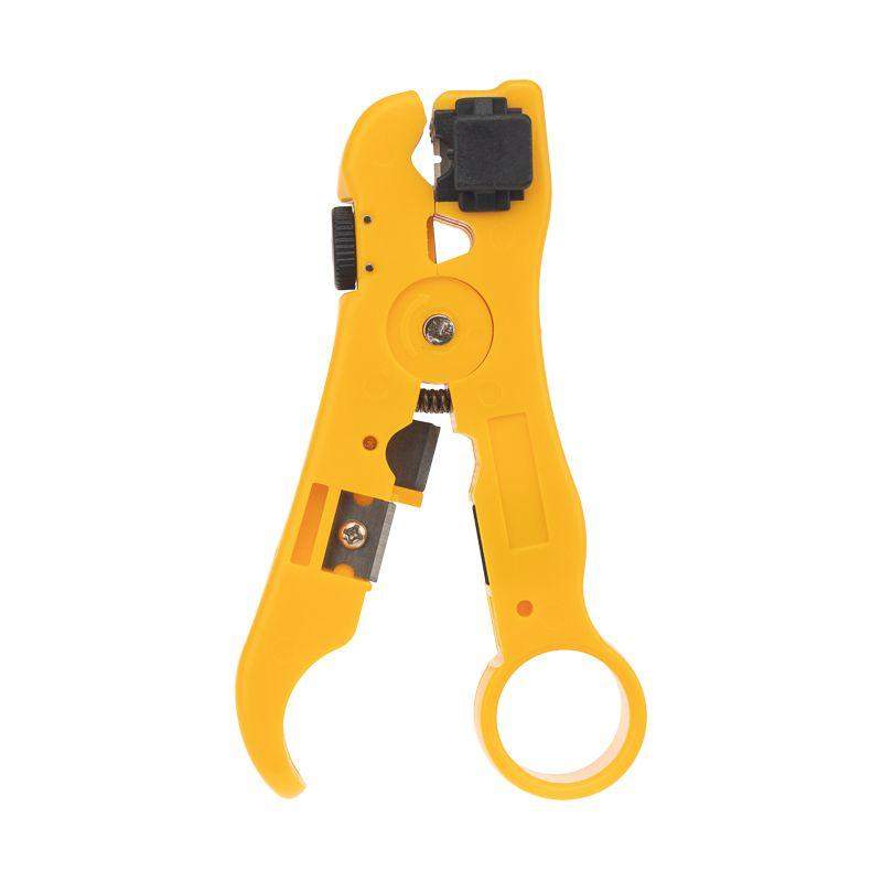 Инструмент HT-302 предназначен для профессиональной зачистки кабелей RG-58, RG-59 и RG-6, RG-11. Корпус инструмента изготовлен из ударопрочного и износостойкого полиамидного пластика. Ножи для зачистки и обрезки кабеля выполнены из нержавеющей стали и могут быть заменены, что позволяет эксплуатировать инструмент длительное время. Производит снятие оболочки и изоляции кабеля одновременно с помощью двух режущих поверхностей путем поворота. Поворотный V-модуль можно установить нужной стороной в зависимости от типа кабеля. Оснащен регулятором для изменения глубины прорезания изоляции, который исключает вероятность повреждение жил кабеля. Возвратный механизм обеспечивает обратный ход рукояток и упрощает процесс работы с инструментом. Пластиковые рукоятки благодаря специальной форме удобно лежат в руке и обеспечивают легкую и приятную работу с инструментом.