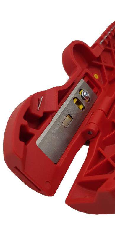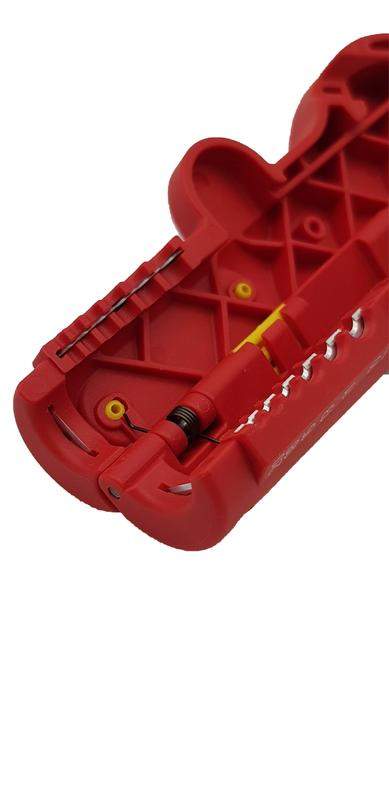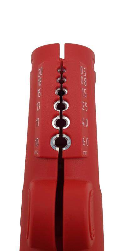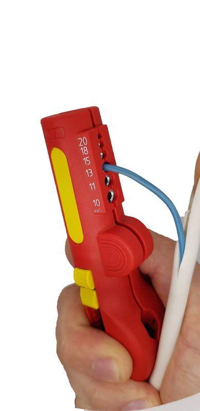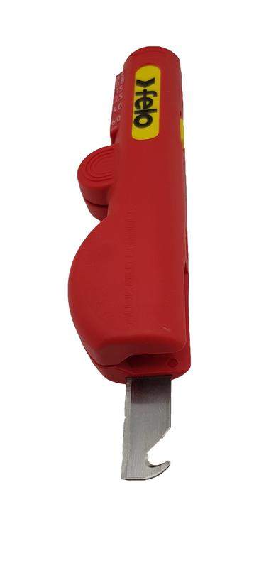 Многофункциональный инструмент для снятия изоляции Felo 58401611 предназначен для зачистки всех распространенных круглых кабелей диаметром от 8 до 13 мм. Он не требует установки глубины резки, так как высокопрочное лезвие специальной формы, покрытое нитрид-титаном, автоматически подстраивается к размеру кабеля. Инструмент имеет несколько лезвий различного назначения: для продольной и поперечной резки оболочки, также выдвижной нож для резки кабеля, устройство для снятия изоляции для круглых проводников сечением от 0,5 до 6,0 мм. Нож не используется при работе под напряжением, т.к. не имеет диэлектрического покрытия.