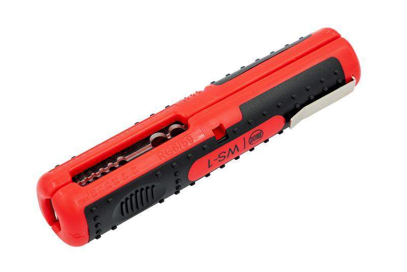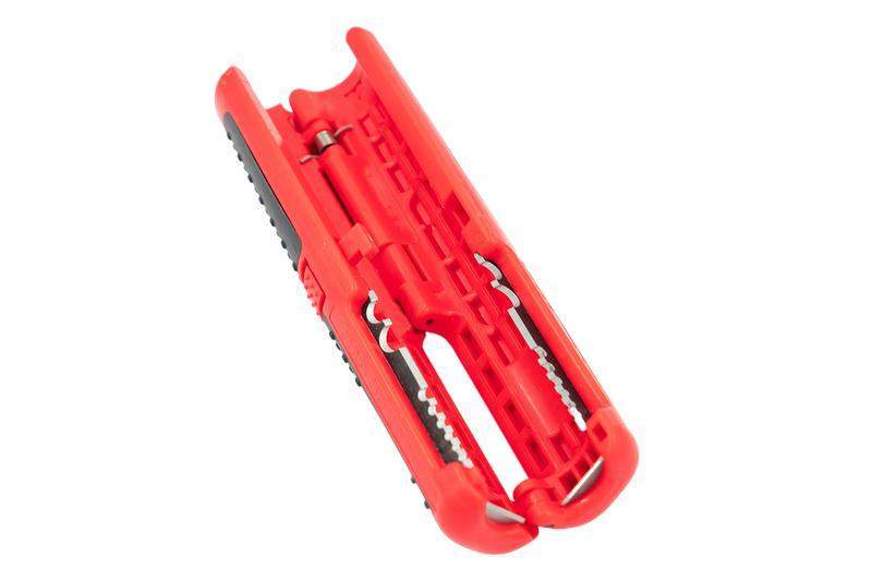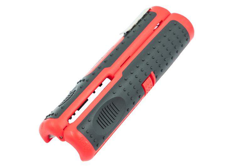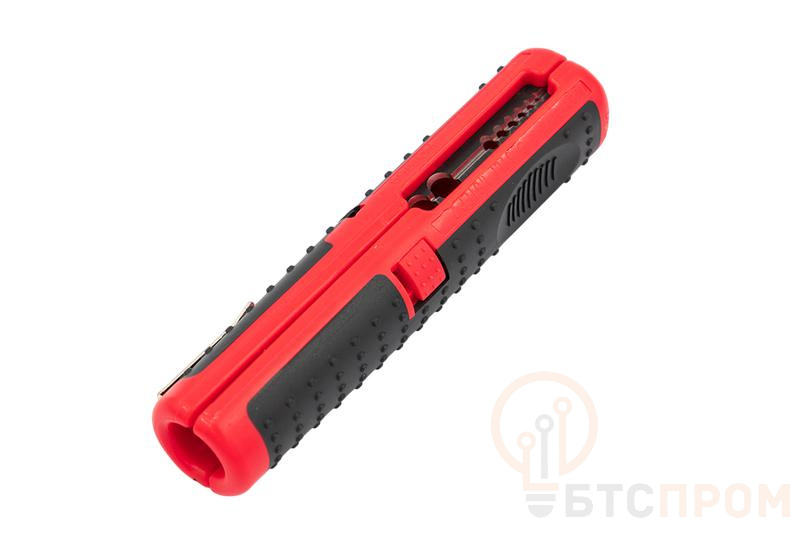 Стриппер представляет собой устройство цилиндрической формы - располовиненную рукоятку с прорезями для снятия изоляции/оболочки с проводников малого сечения. Основной материал рукоятки - композитный материал, материал режущих частей - сталь SK5 Снятие изоляции производство путем размещения проводника в соответствующем отверствии стриппера, после чего обе половины складываются закрепляя проводник в положении. Путем радиального и продольного перемещения лезвия по изоляции проводника происходит разделка и последующее снятие изоляции Стриппер для снятия изоляции с проводников малого сечениия, вторичных цепей, внутридомовой проводки, линий связи, коаксиальных кабелей. * зачистка проводников сечением 0,3–4,0 мм? * лезвия изготовлены из высококачественной инструментальной стали SK5. * твердость режущих кромок по Роквелу (HRC) - 55-60 * прецизионная заточка режущих кромок * двухкомпонентная ручка с ABS+TPR