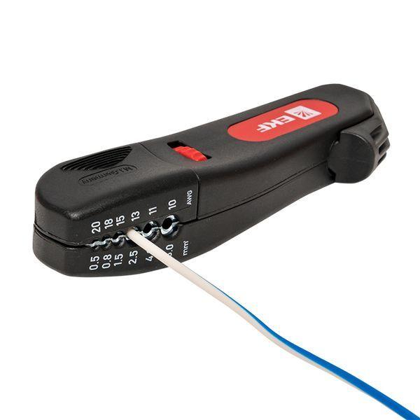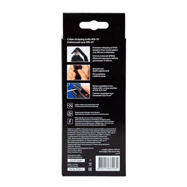 WS-19 кабельный нож с приспособлением для снятия изоляции всех распространенных круглых проводов и кабелей (тонкожильный и массивный кабель в ПВХ изоляции) от 4 до 28мм. Встроенная в корпус изделия функция снятия изоляции с гибких и жестких монтажных проводов поперечным сечением от 0,5 до 6мм.