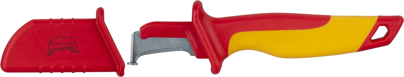 Эргономичная форма рукоятки обеспечивает удобный и уверенный хват, делая работу комфортной и эффективной. Этот нож является незаменимым инструментом для электромонтажников, связистов и специалистов сервисных служб, ценящих безопасность, надежность и функциональность.