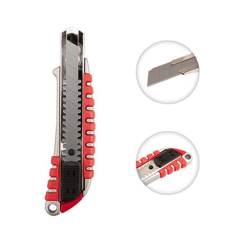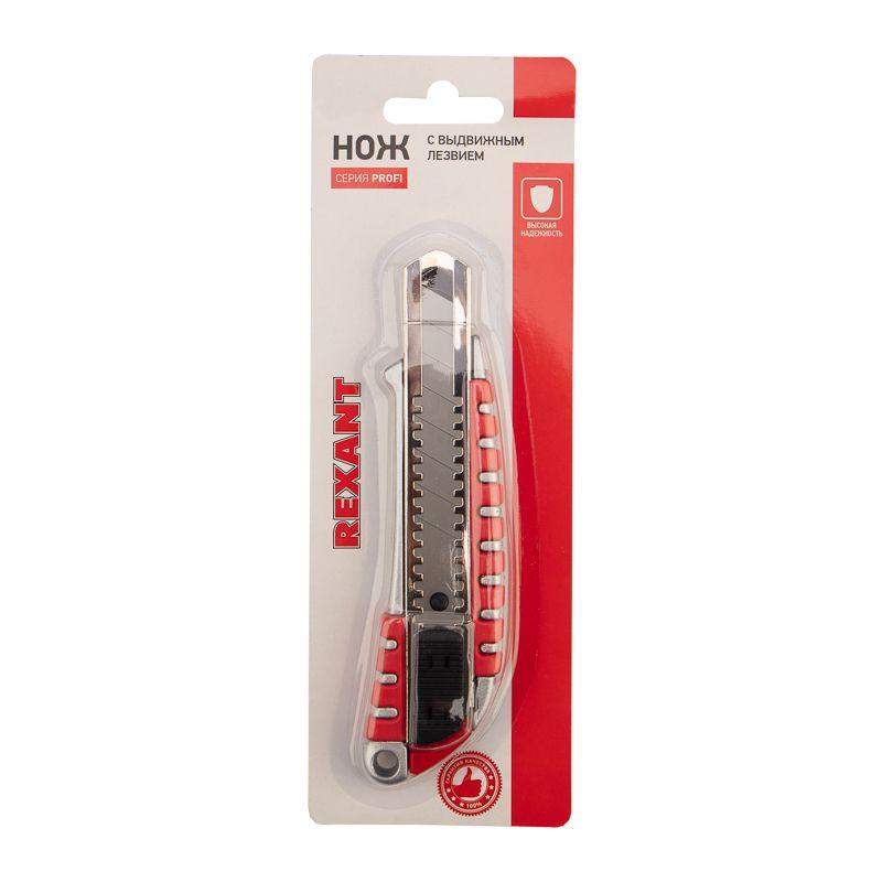 Нож с выдвижным лезвием REXANT – отличный помощник для реза различных материалов: пластика, линолеума, кровельных материалов, гипсокартонных и гипсолитовых плит, бумаги, картона. Корпус ножа выполнен из металла и оснащен эргономичной обрезиненной рукояткой, что обеспечивает комфорт и удобство в процессе использования. Лезвие шириной 18 мм, изготовленное из стали У8А, фиксируется автоматически. Когда крайний сегмент затупляется, его можно отломить и продолжить использовать инструмент. Замена лезвия осуществляется вручную.