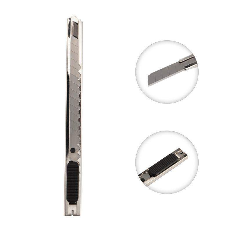 Нож REXANT с выдвижным сегментированным отламывающимся лезвием — отличный помощник для разрезания различных материалов: пластика, картона, бумаги. Корпус ножа выполнен из металла и оснащен клипсой, благодаря которой инструмент можно фиксировать на одежде. Сегментированное лезвие шириной 9 мм изготовлено из высококачественной инструментальной стали. Когда крайний сегмент затупляется, его можно отломить и продолжить использовать инструмент. Замена лезвия быстро и просто осуществляется вручную через хвостовую часть ножа.