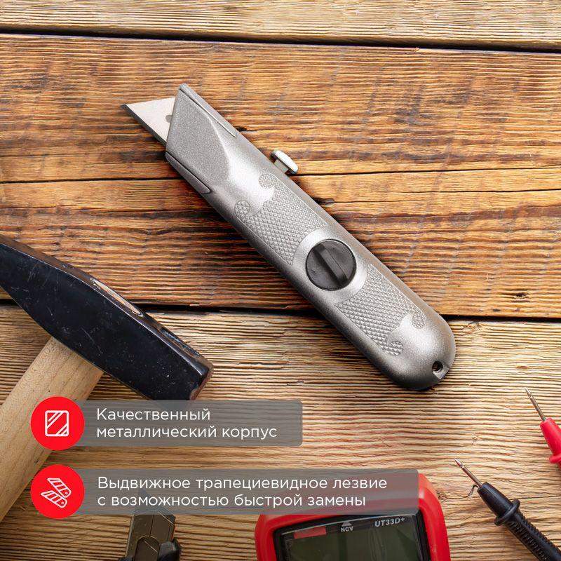Нож с выдвижным трапециевидным лезвием REXANT – отличный помощник для резки различных материалов: пластика, линолеума, кровельных материалов, гипсокартонных и гипсолитовых плит, бумаги, картона. Корпус ножа выполнен из металла, что обеспечивает долговечное использование. Лезвие изготовлено из высококачественной инструментальной стали. Замена быстро и просто осуществляется вручную без использования дополнительных инструментов.