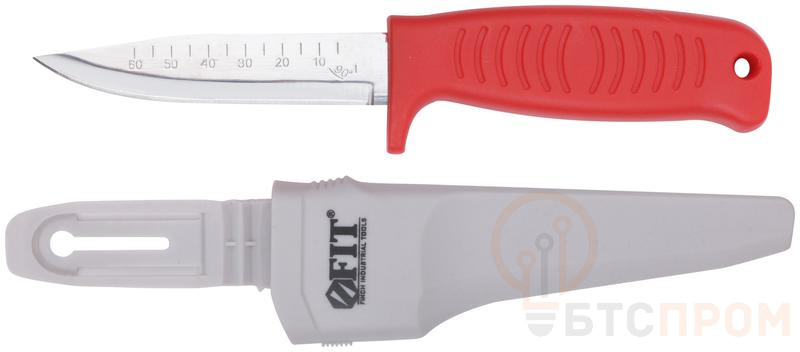 Строительный нож FIT IT – универсальный инструмент для ремонтных и хозяйственных работ. Также может использоваться в походах и для решения бытовых задач. Лезвие выполнено из нержавеющей стали, что обеспечивает его остроту и прочность. Эргономичная рукоятка изготовлена из пластика, на рукоятке есть рельефные бороздки для надежного удержания инструмента в руке. На конце рукоятки отверстие для подвешивания. В комплекте поставляются пластиковые ножны, благодаря которым можно вешать нож на ремень. На лезвие нанесена линейка.