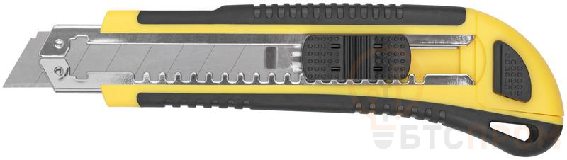 Применяется для резки бумаги, обоев,скотча, картона средней твердости.Отламывающиеся лезвие, автозамена лезвий, с пластиковым прижимом. Приспособление для безопасного удаления затупившихся сегментов лезвия. Пластиковый корпус с резиновыми вставками, усиленный металлической направляющей, лезвие из инструментальной стали.