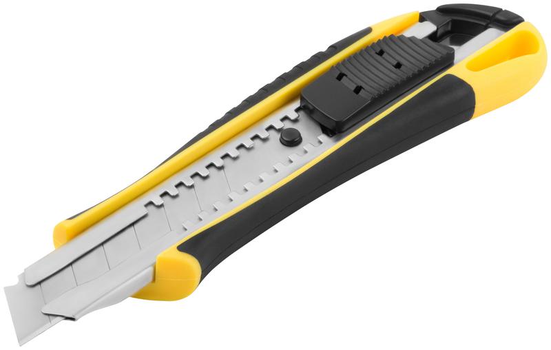 Применяется для резки бумаги, обоев,скотча, картона средней твердости.Отламывающееся' лезвие с пластиковым прижимом. Металлическая направляющая с двусторонней автофиксацией для усиления конструкции.Прорезиненный корпус из ударопрочного ABS пластика, усиленный металлической направляющей, лезвие из высокоуглеродистой стали.Затупившийся сегмент лезвия можено отломить пластиковой крышкой, в которой есть специальное отверстие под лезвия