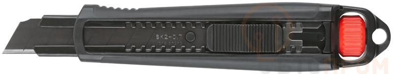 Усиленный. Утолщенное "Отламывающееся" лезвие с пластиковым прижимом. Металлическая направляющая с двусторонней автофиксацией для усиления конструкции. Дополнительный вращающийся прижим в двух крайних положениях позволяет: фиксировать лезвие/открывать отсек для замены лезвия. Лазерная заточка лезвия. Материал: прорезиненный корпус из ударопрочного ABS пластика, направляющая из инструментальной стали с черненым покрытием, лезвие из высокоуглеродистой стали SK-2. Упаковка: блистер.