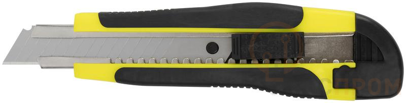 Применяется для резки бумаги, обоев,скотча, картона средней твердости.Отламывающееся' лезвие с пластиковым прижимом, 15 сегментов изготовлено из высокоуглеродистой стали марки 60 и закалено до твердости HRC 56-62.Прорезиненный корпус из ударопрочного ABS пластика, усиленный металлической направляющей, лезвие из высокоуглеродистой стали. Текстурная поверхность резиновой вставки создает дополнительный упор