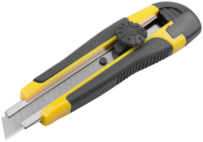 Применяется для резки бумаги, обоев,скотча, картона средней твердости.Сегментированное лезвие 15 сегментов из инструментальной стали. Пластиковый корпус с прорезиненными вставками обеспечивает крепкий захват и предотвращает выскальзывание при экплуатации.Металлические направляющие обеспечивают защиту лезвия от поломки и допускают увеличенные нагрузки