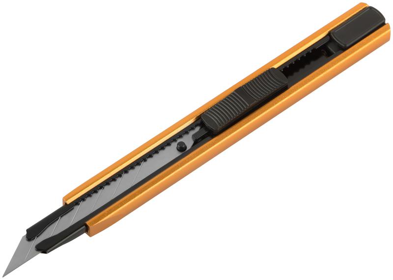 Нож технический' 'отламывающееся'' лезвие с пластиковым прижимом, острый угол 30 градусов позволяет использовать нож в работах с особой точностью. Материал - лезвие из высокоуглеродистой стали, направляющая из инструментальной стали с черным оксидированным покрытием, корпус из алюминиевого сплава. Инструмент с сегментарным клинком, рабочая часть - тонкая стальная пластина с заостренной режущей кромкой, на поверхности которой нанесены поперечные насечки. Режет гипрок, пластик, картон, полимерные пленки.Мелкая перфорация на направляющей позволяет точно установить лезвие.Затупившийся сегмент лезвия можно быстро и безопасно отломить пластиковой крышкой, в которой есть специальное отверстие под лезвие