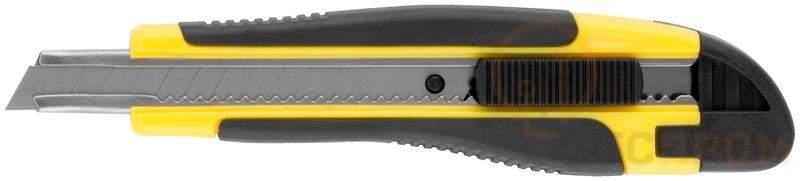 Применяется для резки бумаги, обоев,скотча, картона средней твердости.Пластиковый корпус оснащен текстурной противоскользящей резиновой вставкой, усиленный металлической направляющей. Инструмент с сегментарным клинком, рабочая часть - тонкая стальная пластина с заостренной режущей кромкой, на поверхности которой нанесены поперечные насечки. 14 сегментов лезвия.