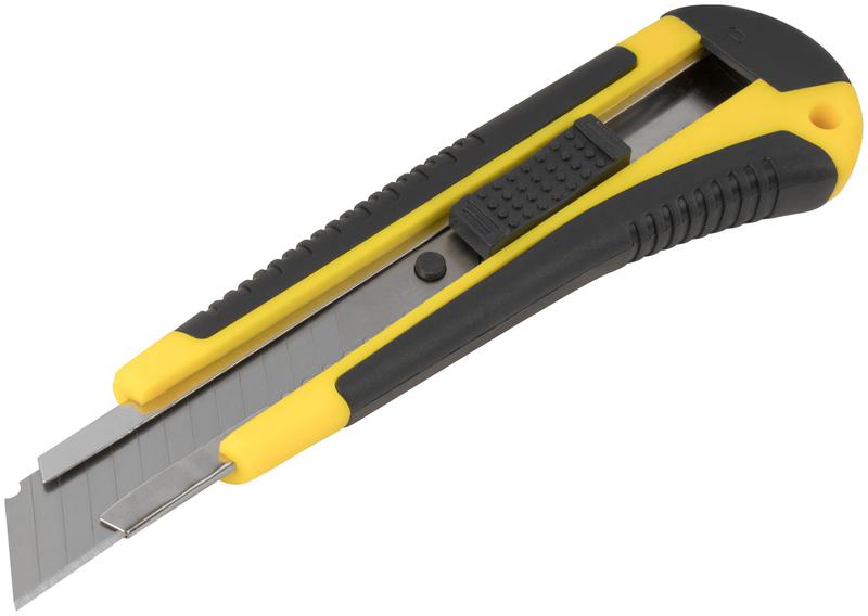 Технический нож FIT "Контур" применяется для резки бумаги, обоев,скотча, картона средней твердости.Пластиковый корпус оснащен текстурной противоскользящей резиновой вставкой, усиленный металлической направляющей. Инструмент с сегментарным клинком, рабочая часть - тонкая стальная пластина с заостренной режущей кромкой, на поверхности которой нанесены поперечные насечки. 14 сегментов лезвия, есть отверстие для темляка