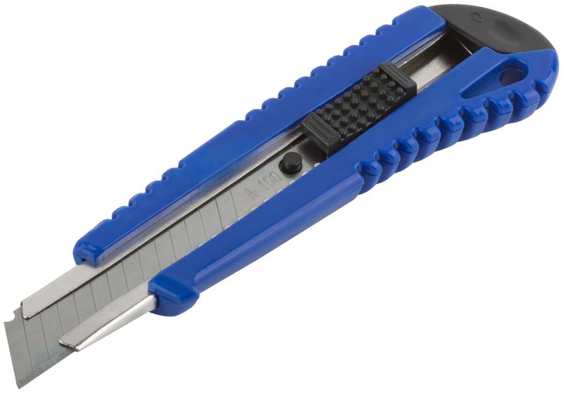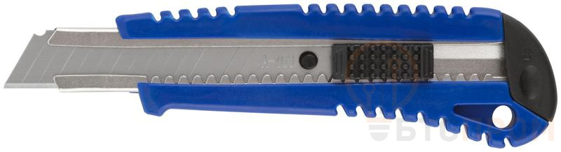 Применяется для резки бумаги, обоев,скотча, картона средней твердости.Рифленая форма ножа обеспечивает крепкий захват и предотвращает выскальзывание при использовании. Компактный корпус изготовлен из пластика, сегментированное лезвие из высокоуглеродистой инструментальной стали состоит из 15 сегментов,гарантирует стабильность во время работы.Нож имеет металлические направляющие и фиксатор лезвия.